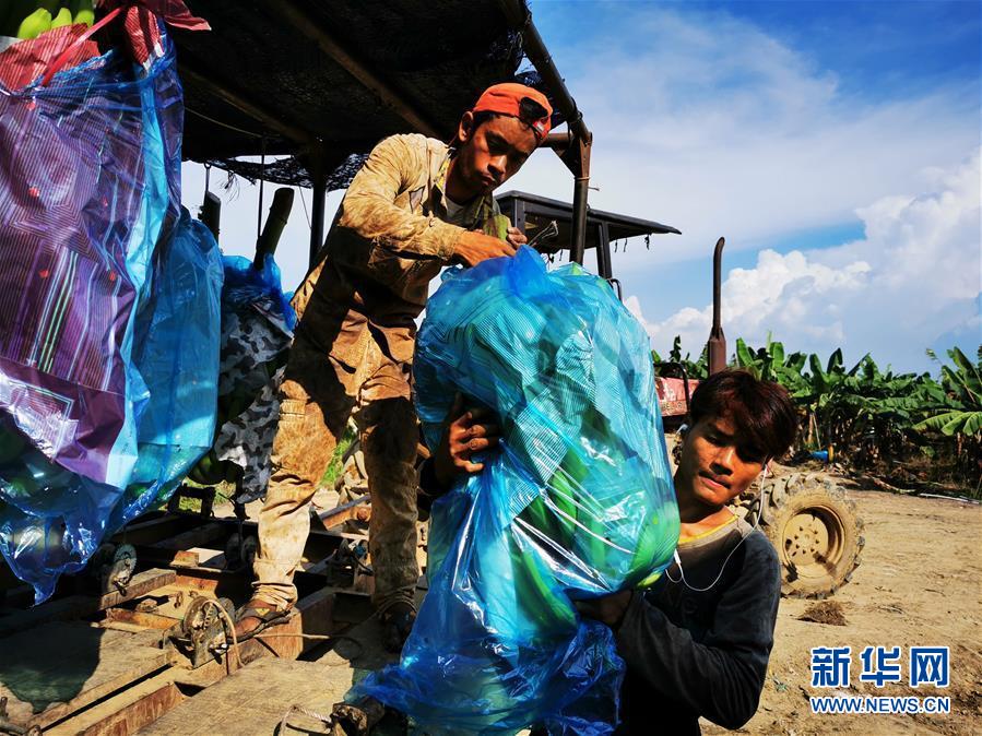 7月16日,在柬埔寨桔井省的柬埔寨—中國熱帶生態(tài)農業(yè)合作示范區(qū)內,工人搬運剛剛收獲的香蕉(手機拍攝)。新華社記者毛鵬飛攝。