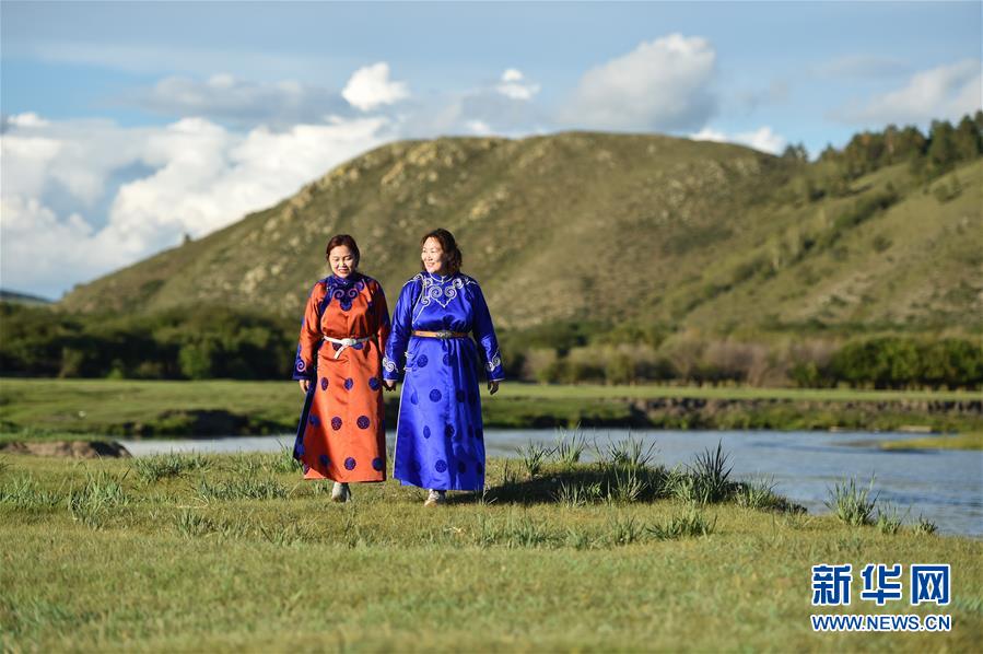 在內(nèi)蒙古自治區(qū)鄂溫克族自治旗伊敏蘇木,艾吉瑪(左)和母親烏仁在伊敏河邊散步(8月6日攝)。