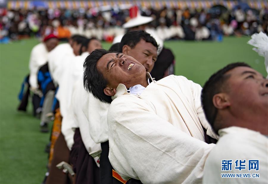 8月10日,當雄縣牧民在拔河比賽中。新華社記者晉美多吉攝。