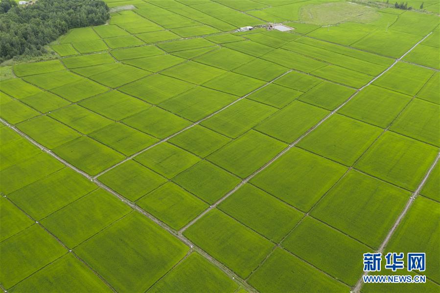 8月11日在撫遠市拍攝的稻田(無人機照片)。時下,“華夏東極”黑龍江省撫遠市的水稻長勢良好,蒼翠的稻田一望無際,猶如綠毯鋪在大地上。新華社記者謝劍飛攝。