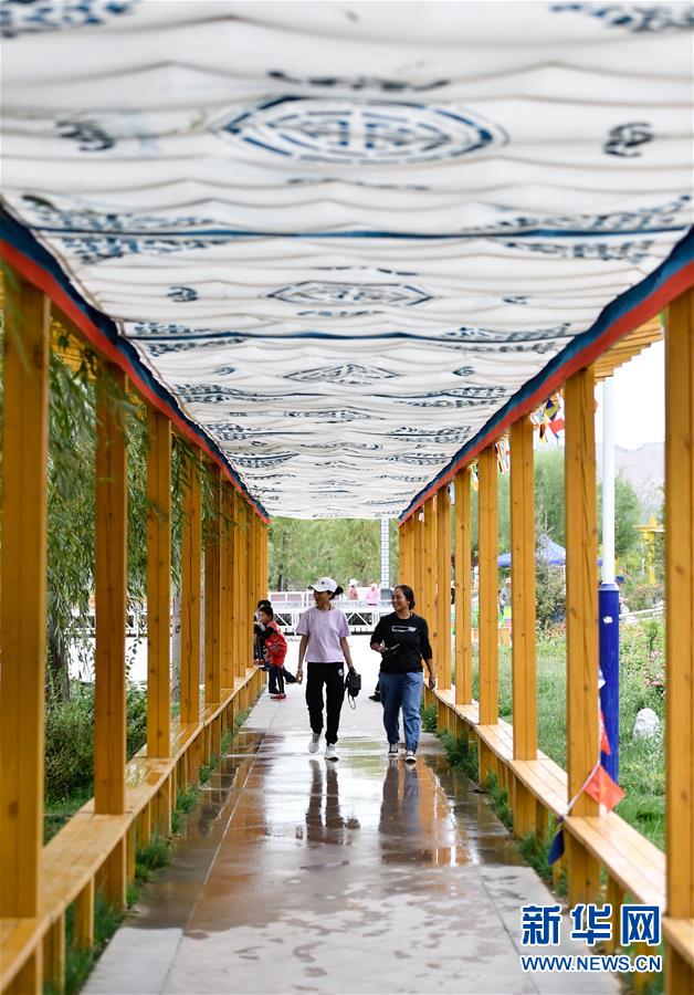 8月11日,游客在尖扎縣昂拉鄉(xiāng)德吉村景觀長(zhǎng)廊內(nèi)游玩。新華社記者張龍攝