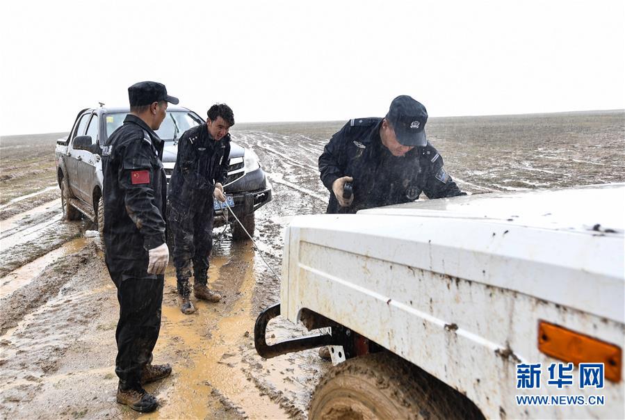 7月6日,卓乃湖保護(hù)站站長(zhǎng)秋培扎西(右)和巡山隊(duì)員更松多杰(左)、白瑪東周在可可西里地區(qū)冒雨拉車。新華社記者張龍攝