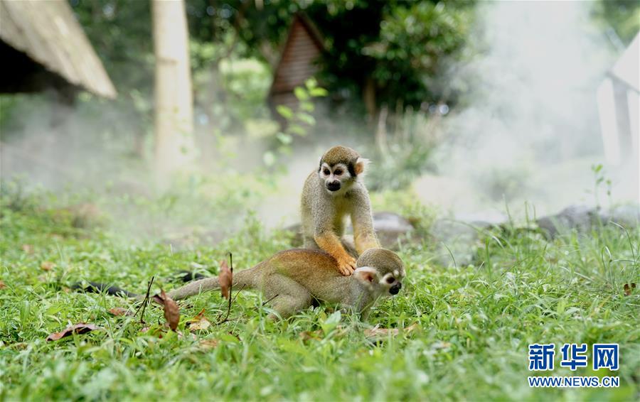 8月11日,上海動(dòng)物園的松鼠猴在“地噴”營(yíng)造的水霧中玩耍。當(dāng)日,上海最高溫度達(dá)到35攝氏度,上海動(dòng)物園開啟園內(nèi)安裝的各種噴淋裝置,讓動(dòng)物們防暑降溫,樂享清涼。新華社記者張建松攝