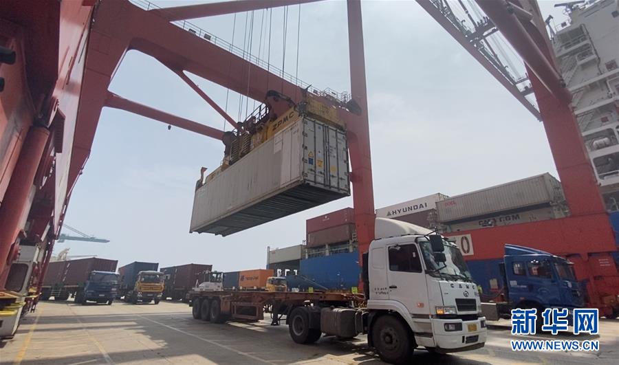 貨車在天津港集裝箱碼頭等待直提貨物(8月4日攝)。新華社記者張宇琪攝