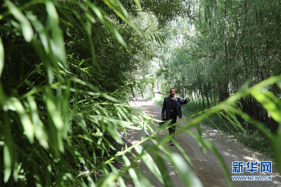 甘肅省金昌市永昌縣下四壩村村民徐文國走在林間小道上,兩旁的樹都是他15年前栽的(7月10日攝)。新華社記者 杜哲宇 攝