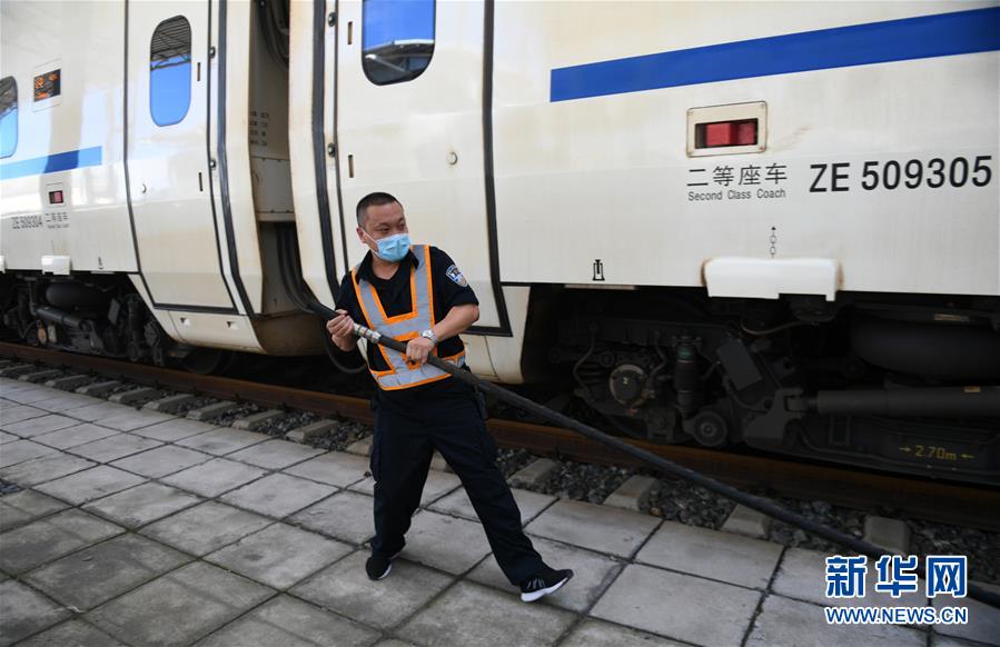8月12日,長(zhǎng)春火車站客運(yùn)車間上水工龔關(guān)在給列車上水。新華社記者 林宏 攝
