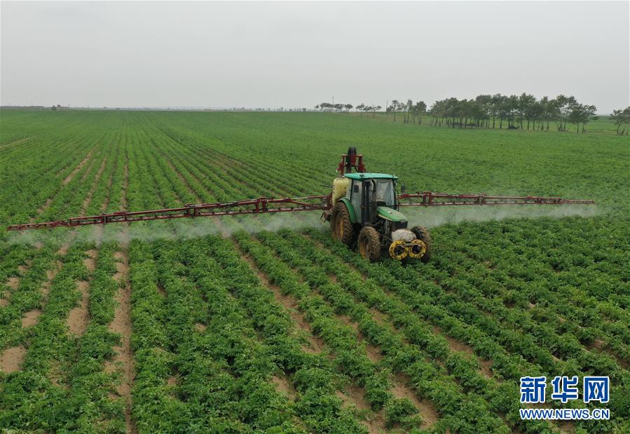 8月12日,在尚義縣三工地鎮(zhèn)有德元村,農(nóng)民使用機械設(shè)備在田間給旱作馬鈴薯噴灑農(nóng)藥(無人機照片)。