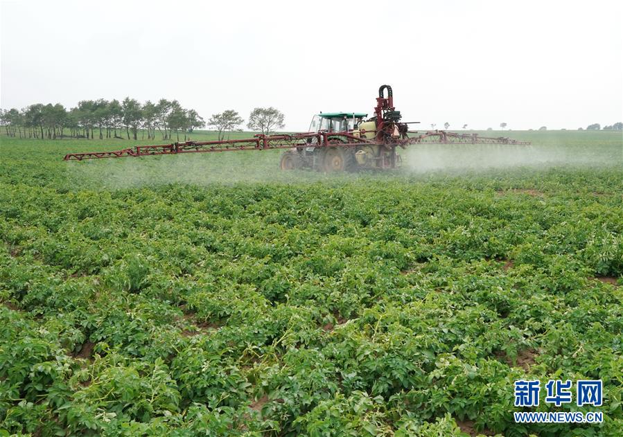 8月12日,在尚義縣三工地鎮(zhèn)有德元村,農(nóng)民使用機械設(shè)備在田間給旱作馬鈴薯噴灑農(nóng)藥。新華社記者 楊世堯 攝