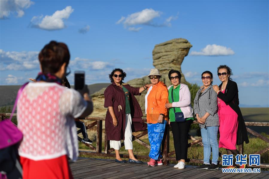 游客在克什克騰石陣景區(qū)拍照留影(8月11日攝)??耸部蓑v旗位于內蒙古自治區(qū)赤峰市西北部,境內的湖泊、河流、草原、森林等自然景觀,讓人們流連忘返。新華社記者劉磊攝