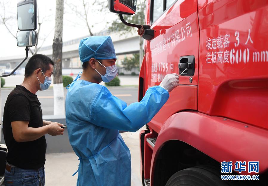 工作人員在新發(fā)地批發(fā)市場周轉(zhuǎn)新區(qū)對進場車輛進行取樣(8月6日攝)。 新華社記者 張晨霖 攝