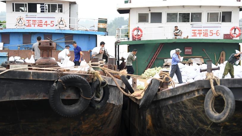 7月14日,當(dāng)?shù)卮迕裢簧习徇\砂石袋。當(dāng)?shù)胤姥床块T組織船只裝載砂石袋等防汛物資,運往圩堤保防汛。