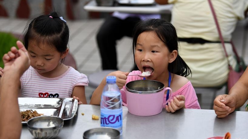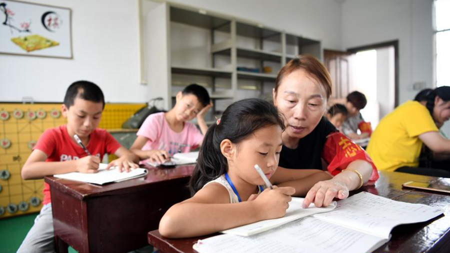 7月16日,在安徽省宿松縣洲頭鄉(xiāng)中心小學(xué)集中安置點,教師志愿者輔導(dǎo)孩子們完成暑假作業(yè)。