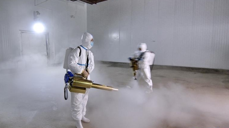 7月14日,北京二商肉類食品集團有限公司員工在對肉類運輸車輛停靠區(qū)域進行防疫消毒。