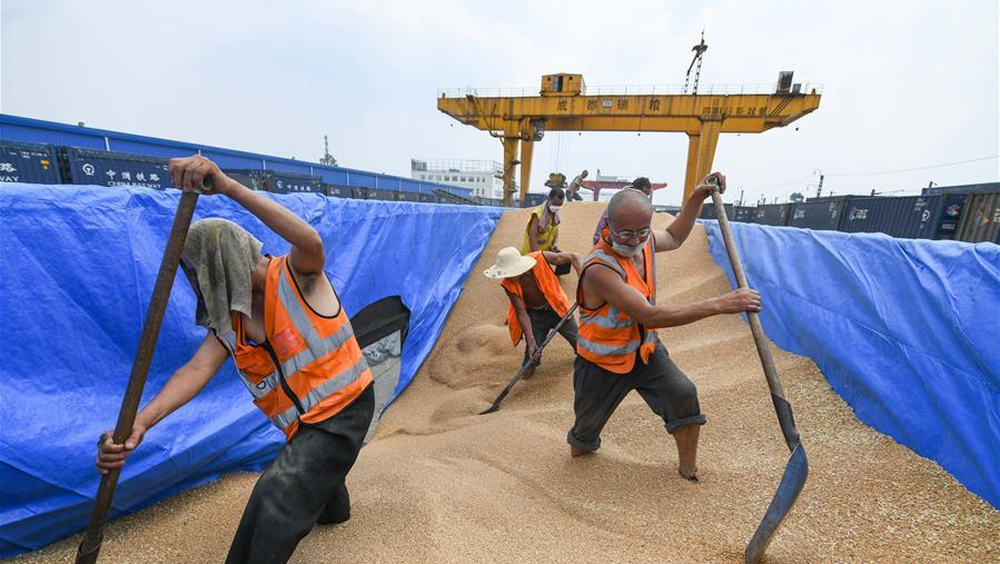 6月10日,在成都糧食集團青白江國家糧食儲備庫,工人在運糧火車的貨廂內卸貨。