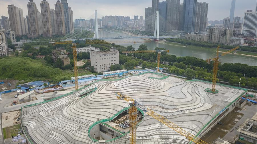 這是6月10日拍攝的已經完成主體結構和現(xiàn)場屋面施工的武漢琴臺美術館(無人機照片)。