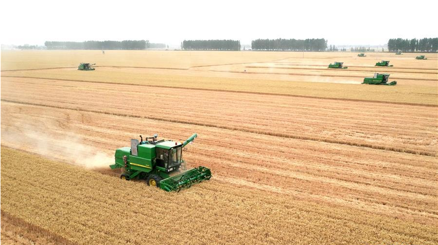 “三夏”時節(jié),中原大地一片金黃。位于河南省周口市的黃泛區(qū)農(nóng)場機(jī)聲隆隆,10萬畝小麥?zhǔn)斋@正酣。