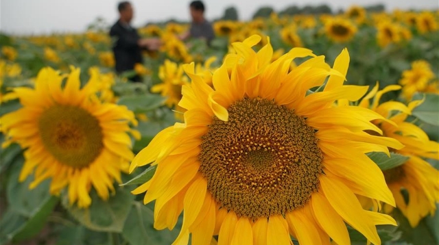 初秋時(shí)節(jié),位于甘肅省白銀市景泰縣寺灘鄉(xiāng)的十萬(wàn)畝向日葵競(jìng)相綻放,金黃的葵花張開“笑臉”,迎接豐收。