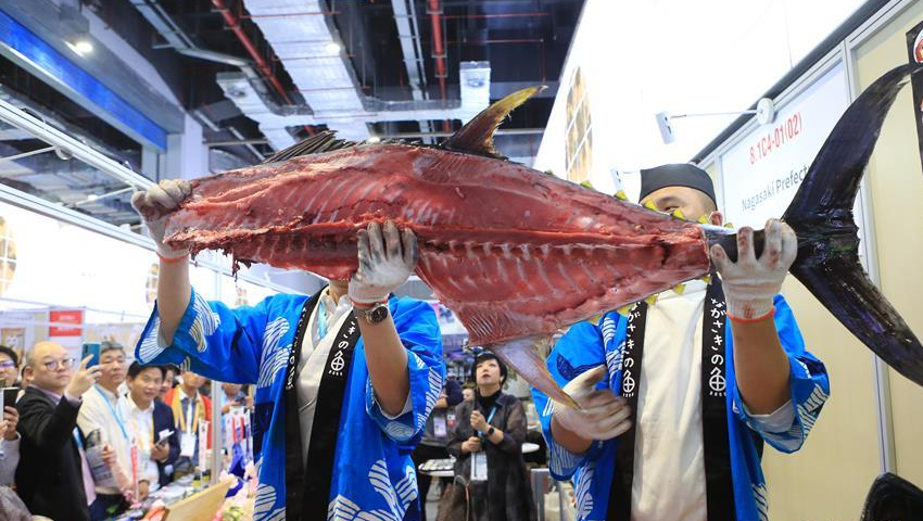 11月7日,來自日本長崎魚市株式會社的專業(yè)切魚師傅現(xiàn)場解體一條70公斤的藍(lán)鰭金槍魚,吸引大量參觀者觀看、品嘗。