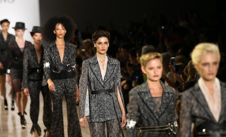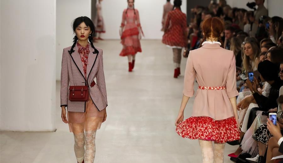 9月17日,在英國倫敦,模特在2020倫敦春夏時裝周上展示Charlotte Knowles品牌服飾(多重曝光)。