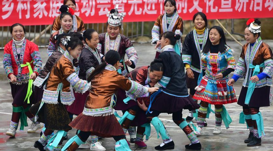 當日,廣西融水苗族自治縣桿洞鄉(xiāng)黨鳩村在柳州市婦聯(lián)支持下,在烏英苗寨舉辦家庭運動會,通過挑禾把、趣味籃球賽等活動,迎接即將到來的傳統(tǒng)苗年。