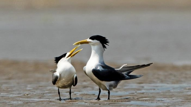 眼下正是大鳳頭燕鷗繁育的時(shí)節(jié),在福建閩江河口濕地核心區(qū)鱔魚(yú)灘的沙洲上,大鳳頭燕鷗正相互嬉戲。