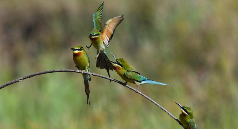 近日,百余只栗喉蜂虎和少量藍(lán)喉蜂虎來到海南省??谑形骱0抖鄠€地點棲息繁衍,為椰城增添一抹亮色。