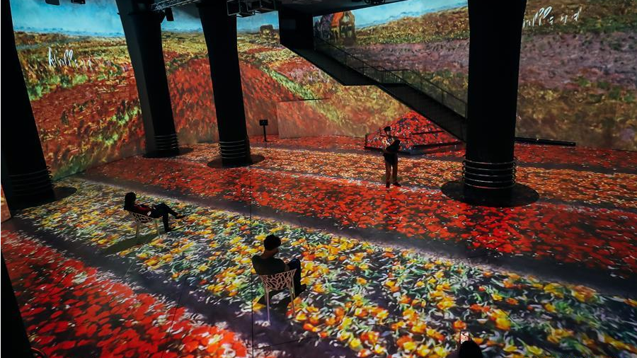 這是6月10日在比利時布魯塞爾拍攝的“沉浸式莫奈藝術(shù)展”現(xiàn)場。