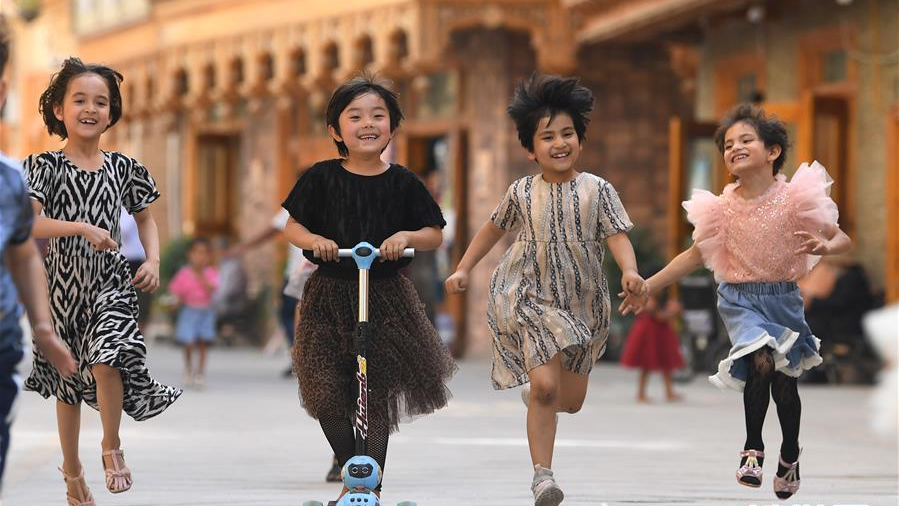 5月27日,孩子們在新疆和田市“團城”的鴿子巷玩耍。