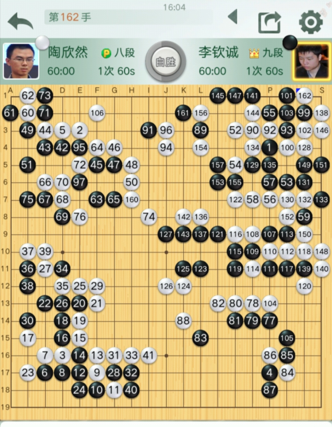 第三臺李欽誠九段VS陶欣然八段(對局棋譜)。陶欣然率先鳴金,贏下一局。領隊梁偉棠九段對這盤棋很贊賞,認為陶欣然這盤棋下得非常漂亮,氣勢磅礴,有宇宙流再現(xiàn)的感覺。開局在左下角形成白棋取外勢,黑棋取實地的局面后,陶欣然將外勢發(fā)揮到淋漓盡致,在上面左右兩個角都繼續(xù)貫徹意圖,全力推進,形成了從上邊至中腹的巨大模樣,特別是在右下角一步五路尖沖,技驚四座,后來黑棋勉強進來中腹破空,遭到陶欣然的全部殲滅。白棋僅162手,就取得了勝利!技驚四座那步棋是78手,猶如絕藝附身。