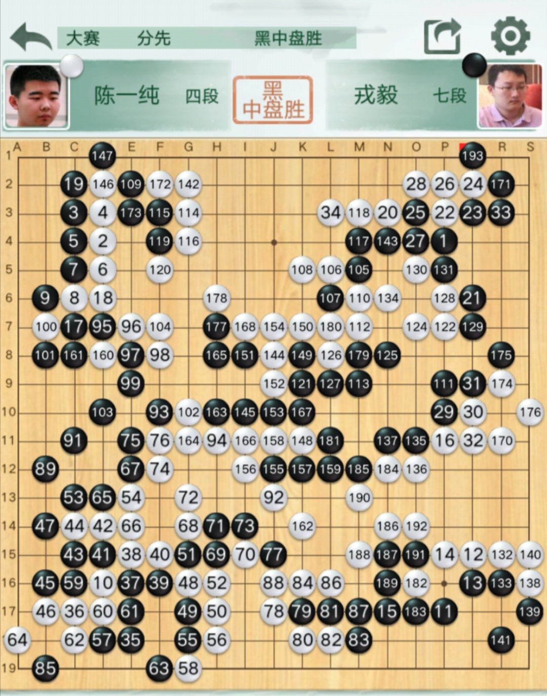 沈沛然自評:布局大致兩分,中盤白棋76斷失誤,應(yīng)當(dāng)左上角斷補,那樣局面尚早,實戰(zhàn)形成轉(zhuǎn)換黑棋大賺,勝局已定。