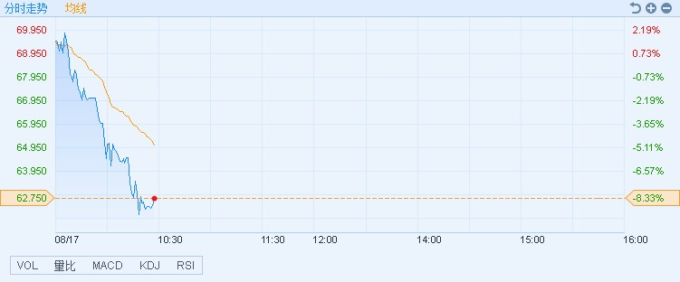 受產(chǎn)業(yè)政策影響,醫(yī)藥股普跌,藥明生物(02269)領(lǐng)跌板塊,連續(xù)三個交易日下挫,跌逾兩成。截至10時26分,跌8.33%,報價62.75港元,成交額2.27億。