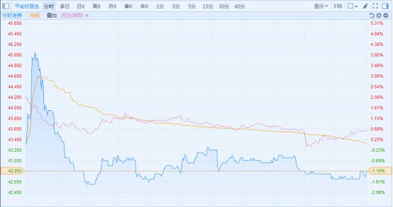 正式納入港股通的平安好醫(yī)生也明顯受到拖累。如果平安好醫(yī)生的分時(shí)圖和恒生指數(shù)的分時(shí)圖疊加,可以看出,平安好醫(yī)生早段有有迅速?zèng)_高的勢(shì)頭,但隨后受到大市的影響而轉(zhuǎn)跌,此后走勢(shì)與大盤幾乎同步。不過(guò),平安好醫(yī)生走勢(shì)相對(duì)穩(wěn)健,最終僅跌1.15%,跑贏恒指,報(bào)價(jià)42.85港元,成交額1777萬(wàn)港元。