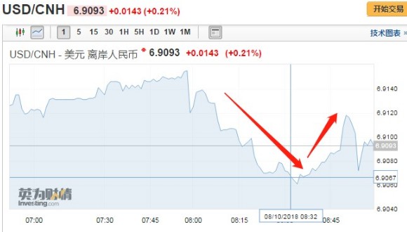 人民幣早盤一度跌逾200點后短線拉升 現(xiàn)報6.9093