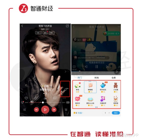 在用戶進(jìn)入K歌界面后,除了K歌按鍵還有就是歌曲榜單,這些榜單記錄的是該歌曲翻唱獲得禮物數(shù)的排行情況。翻唱歌手被打賞的禮物越多,榜單排名越高,禮物則是靠用戶通過現(xiàn)金兌換而來。與直播打賞類似,全民K歌也是通過用戶購買虛擬禮物進(jìn)行變現(xiàn)。