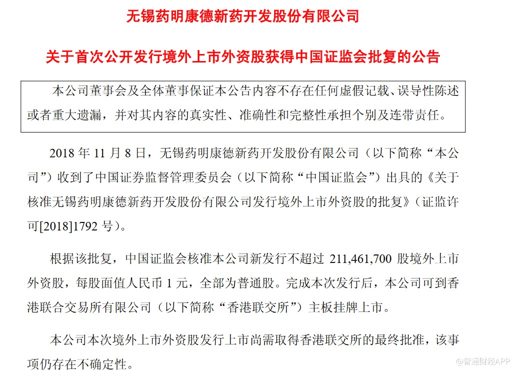 根據(jù)該批復,中國證監(jiān)會核準藥明康德新發(fā)行不超過2.11億股境外上市外資股,每股面值人民幣1元,全部為普通股。完成本次發(fā)行后,藥明康德可到香港聯(lián)交所主板掛牌上市。