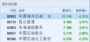 國際原油價(jià)格大跳水,港股石油股早盤股價(jià)遭重創(chuàng),截至9時(shí)20分,中海油(00883)跌4.35%,報(bào)價(jià)12.74港元。