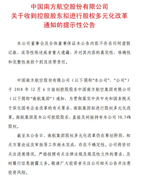 公告中稱,中國南方航空股份有限公司于2018年12月6日接到控股股東中國南方航空集團有限公司通知,為貫徹落實中共中央和國務(wù)院關(guān)于深化國有企業(yè)改革的有關(guān)要求,南航集團擬進行股權(quán)多元化改革。南航集團是本公司控股股東,直接及間接持有本公司50.54%股權(quán)。截至本公告日,南航集團股權(quán)多元化改革仍在籌劃階段,相關(guān)方案論證及審批等工作尚未完成,存在不確定性。公司將密切關(guān)注進展情況,嚴格按照有關(guān)法律法規(guī)及規(guī)范性文件的要求,及時履行信息披露義務(wù)。(文文)