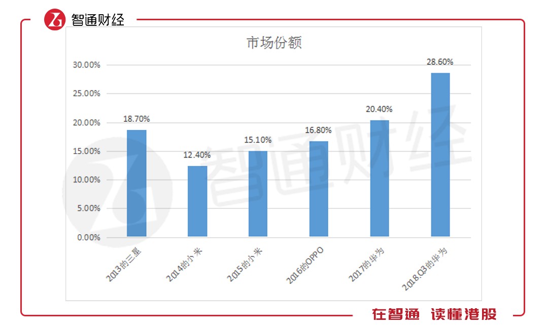 在2008年,全球前六大手機(jī)廠商,諾基亞、三星、摩托羅拉、LG、索尼愛立信和中興(00763),其中只有中興為自主品牌,但市場(chǎng)份額不足5%。再看看2018年這十年的變化,全球前六大手機(jī)廠商,三星、華為、蘋果、小米(01810)、OPPO和Vivo,其中自主品牌占了四個(gè),市場(chǎng)份額合計(jì)占比達(dá)40%。