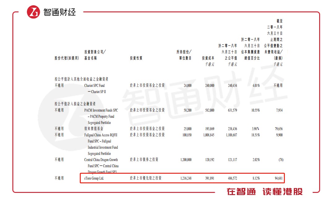 值得一提的是,中民金融的重大投資中,其于今年4月份才投資的eToro,截至2018年上半年期間的公平值變動未變現(xiàn)損益為9468萬港元,而該項投資僅占其資產總值的8.12%。