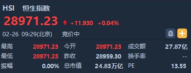智通財(cái)經(jīng)APP獲悉,恒生指數(shù)開(kāi)盤漲0.04%%,報(bào)28971.23點(diǎn)。國(guó)企指數(shù)張0.19%,報(bào)11653.15點(diǎn)。紅籌指數(shù)張0.13%,報(bào)4565.49點(diǎn)。大市盤前成交27.87億港元。隔夜美股小幅收漲,大型科技股集體收漲,港股ADR指數(shù)全日僅微升。