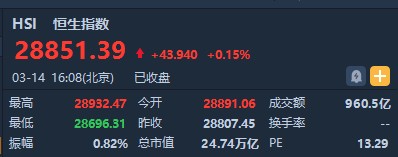 截至收盤,恒生指數(shù)漲43.94點(diǎn)或0.15%,報(bào)28851.39點(diǎn),全日成交額達(dá)960.51億。國(guó)企指數(shù)漲41.45%,報(bào)11447.27點(diǎn),紅籌指數(shù)漲0.56%,報(bào)4513.25點(diǎn)。