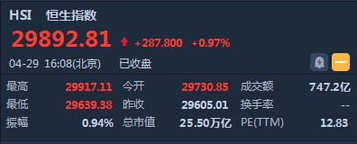 港股收盤(pán)(4.29)|恒指升287點(diǎn)報(bào)29892點(diǎn)僅成交747億
