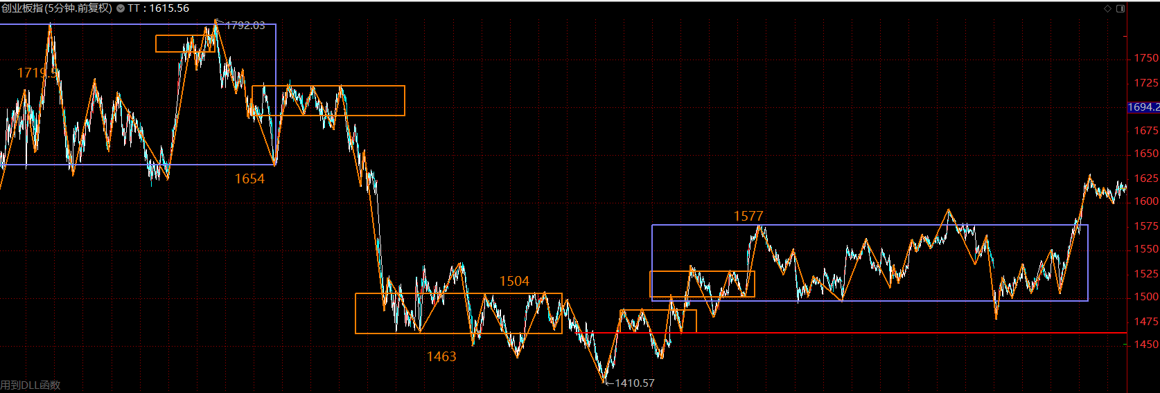 創(chuàng)業(yè)板這里在構(gòu)建30分鐘級(jí)別的三買(mǎi),周一如果不跌破1577點(diǎn),這里將是創(chuàng)業(yè)板主升行情的起點(diǎn)。如若重新跌回中樞內(nèi)部,則按中樞震蕩處理。創(chuàng)業(yè)板走勢(shì)要強(qiáng)于主板很多,后續(xù)行情多半仍然圍繞創(chuàng)業(yè)板展開(kāi)。