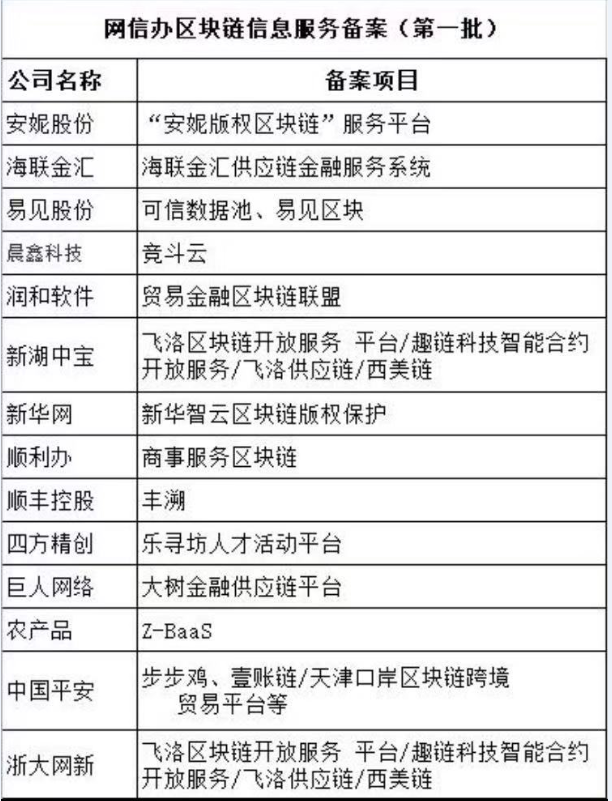 第一批區(qū)塊鏈信息服務備案于3月30日發(fā)布:A股公司涉及安妮股份、海聯(lián)金匯、易見股份、晨鑫科技、潤和軟件、新湖中寶、新華網(wǎng)、順利辦、順豐控股、四方精創(chuàng)、巨人網(wǎng)絡、農(nóng)產(chǎn)品、中國平安、浙大網(wǎng)新。