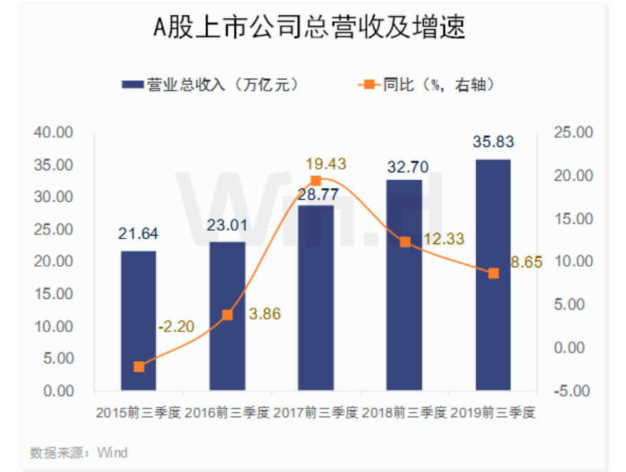 2019年前三季度A股上市公司合計實現(xiàn)營業(yè)總收入35.83萬億元,同比增長8.65%;實現(xiàn)凈利潤(備注:以下統(tǒng)計均為歸屬母公司凈利潤)3.19萬億元,同比增長6.77%。