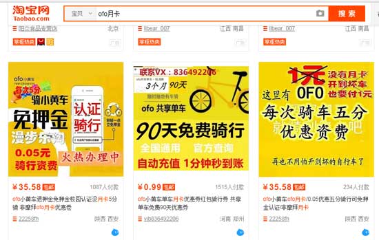 人民網(wǎng)IT頻道記者在調(diào)查中發(fā)現(xiàn),在摩拜和ofo的月卡漲價5-10倍的同時,兩家公司大量的高折扣優(yōu)惠卡卻轉(zhuǎn)移到淘寶等電商平臺公開出售,在淘寶上輸入“摩拜月卡”、“ofo月卡”則出現(xiàn)了大批免押金、8.8元包月、9.99元包月、0.05元騎行資費的廣告,這些高折扣的優(yōu)惠卡從何而來,卻是一個謎。