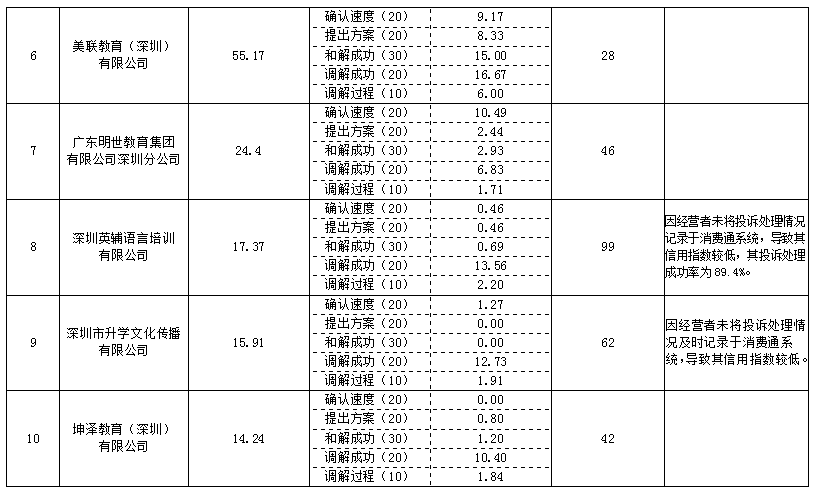 深圳英輔語言培訓(xùn)有限公司和深圳市升學(xué)文化傳播有限公司因經(jīng)營者未將投訴處理情況記錄于消費(fèi)通系統(tǒng),導(dǎo)致兩家企業(yè)信用指數(shù)較低。其中深圳英輔語言培訓(xùn)有限公司投訴處理成功率為89.4%,因未記錄于消費(fèi)通系統(tǒng),極大地影響其信用指數(shù)和排名。深圳市消委會在此提醒各行業(yè)企業(yè),重視消費(fèi)者權(quán)益保護(hù)工作,及時處理消費(fèi)者投訴、與消費(fèi)者提早和解,嚴(yán)格按照消費(fèi)通系統(tǒng)要求記錄投訴處理情況,體現(xiàn)消費(fèi)維權(quán)信用對消費(fèi)者的消費(fèi)指導(dǎo)作用。