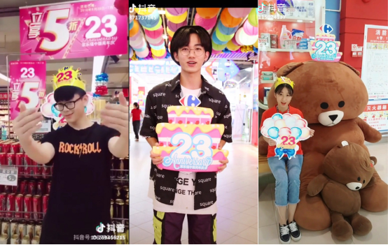 6月29日至8月5日,家樂(lè)福華南區(qū)在抖音APP上發(fā)起了話題挑戰(zhàn)——“#手指+舞,猜猜你幾歲”。顧客只需要在任一家樂(lè)福門店,伴隨“家樂(lè)福生日快樂(lè)”的同款音樂(lè)節(jié)拍,跳出指定姿勢(shì)的手指舞,即有機(jī)會(huì)贏取最高4999元的超級(jí)大獎(jiǎng)。