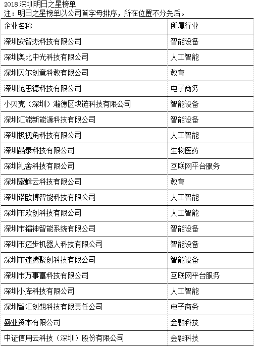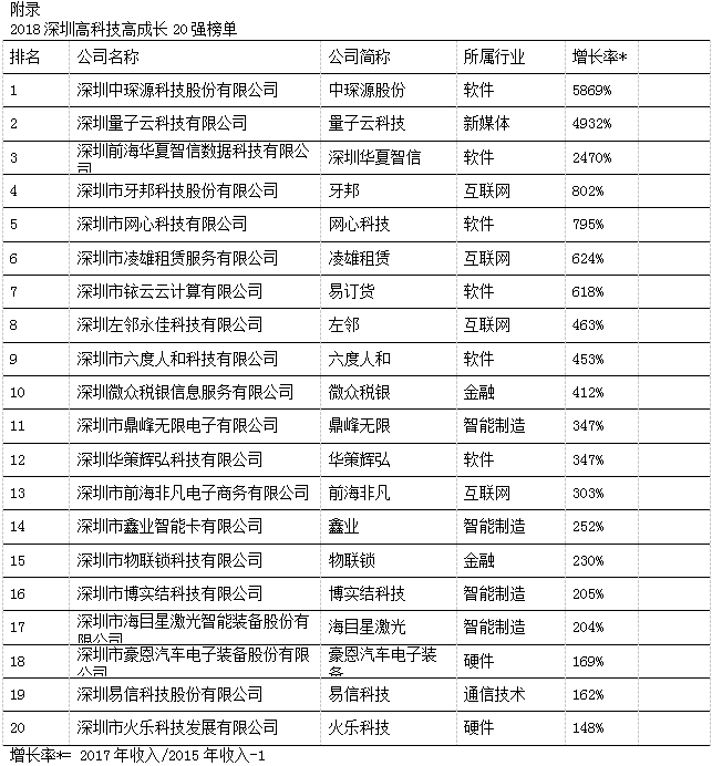 今年,榮登“深圳20強(qiáng)”三甲的獲獎(jiǎng)企業(yè)分別為深圳中琛源科技股份有限公司、深圳量子云科技有限公司和深圳前海華夏智信數(shù)據(jù)科技有限公司,他們?cè)谶^去三年中表現(xiàn)出的平均增長(zhǎng)率分別為5,869%、4,932%和2,470%。本年度入選“深圳20強(qiáng)”的企業(yè)除了軟件、硬件、互聯(lián)網(wǎng)和通訊技術(shù)外,也不乏其他新興領(lǐng)域,如新媒體、智能制造和金融科技。此外,為表彰深圳市當(dāng)?shù)乇憩F(xiàn)優(yōu)秀且極具潛力的初創(chuàng)企業(yè),今年共有20家企業(yè)獲選“深圳明日之星”,它們來自多個(gè)不同的領(lǐng)域,包括人工智能、智能設(shè)備、電子商務(wù)、教育、生物醫(yī)藥、金融科技和互聯(lián)網(wǎng)平臺(tái)服務(wù)等 (詳見附錄)。獲選成為“深圳20強(qiáng)”和“深圳明日之星”的企業(yè),將自動(dòng)成為“中國(guó)高科技高成長(zhǎng)50強(qiáng)”(簡(jiǎn)稱“中國(guó)50強(qiáng)”)和“中國(guó)明日之星”的候選企業(yè),并在今年11月與全國(guó)其他入圍企業(yè)角逐,躋身全國(guó)增長(zhǎng)最快、最具發(fā)展?jié)摿Φ母呖萍计髽I(yè)之列。