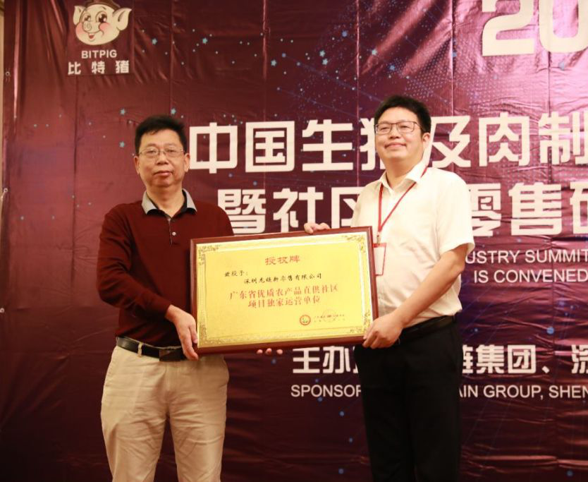 龍鏈集團董事局主席、川豬集團董事長、深圳龍鏈新零售有限公司董事長夏可,上臺接受了這項全廣東省獨家的授權牌,并發(fā)表感言:這既是廣東省委、省政府對深圳龍鏈新零售有限公司以區(qū)塊鏈、人工智能、物聯(lián)網(wǎng)等領域的高新科技,打造形成了生豬及肉制品等高品質(zhì)“菜籃子工程”系列產(chǎn)品的規(guī)模化、專業(yè)化產(chǎn)供銷及商業(yè)平臺服務“一條龍”的肯定,也是一種鞭策——鞭策龍鏈人將自創(chuàng)的“比特豬”品牌穩(wěn)固為中國高端健康食品結(jié)合社區(qū)新零售領域的第一品牌,并不斷推動市民能夠以更便捷的方式與更良好的消費體驗,獲得高品質(zhì)的放心食品。